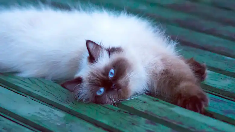 Ragdoll cats are one of the fluffy cat breeds that are known for being sweet, friendly relaxed. They are called ragdoll cats because when you pick them up, they typically limp like a ragdoll (because they are relaxed, not because they're fearful). These felines get along well with kids and make for excellent family pets.