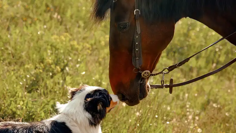 Despite their large size, horses are prey animals. This means they tend to size up potential threats carefully before responding, including blue heelers that are a fraction of their weight, but curiosity usually overrides caution in safe settings. In a shared environment like Brandi's ranch, horses and dogs can build a mutual understanding, even friendship, like the one that formed after a horse met a golden retriever puppy for the first time. In fact, a 2020 study in Behavioural Processes shows that dogs and horses can play together using shared nonverbal cues, like relaxed open mouths and even rapid facial mimicry.