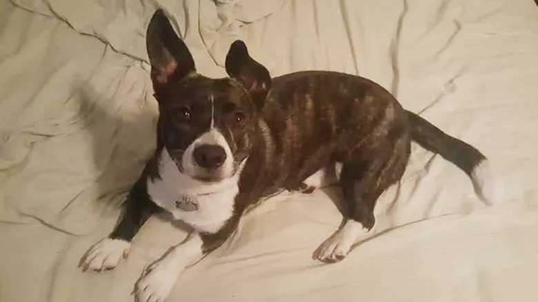 With a medium brown face and dark grey and charcoal body, this corgi mix could easily walk down a fashion runway.