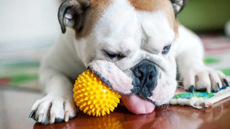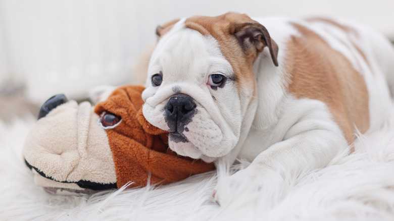Remember that teething is stressful and painful for puppies, including English bulldogs. Dogs, especially when teething, often cope by chewing. This is a perfectly normal way of self-soothing as long as they're chewing on a toy or teething ring and not your shoes, furniture, or other household items.